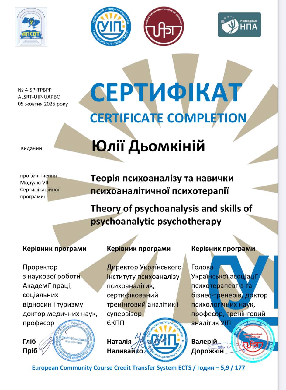 - 945 часов - в процессе изучения Теория психоанализа и навыки психоаналитической психотерапии (Украинский институт психоанализа)