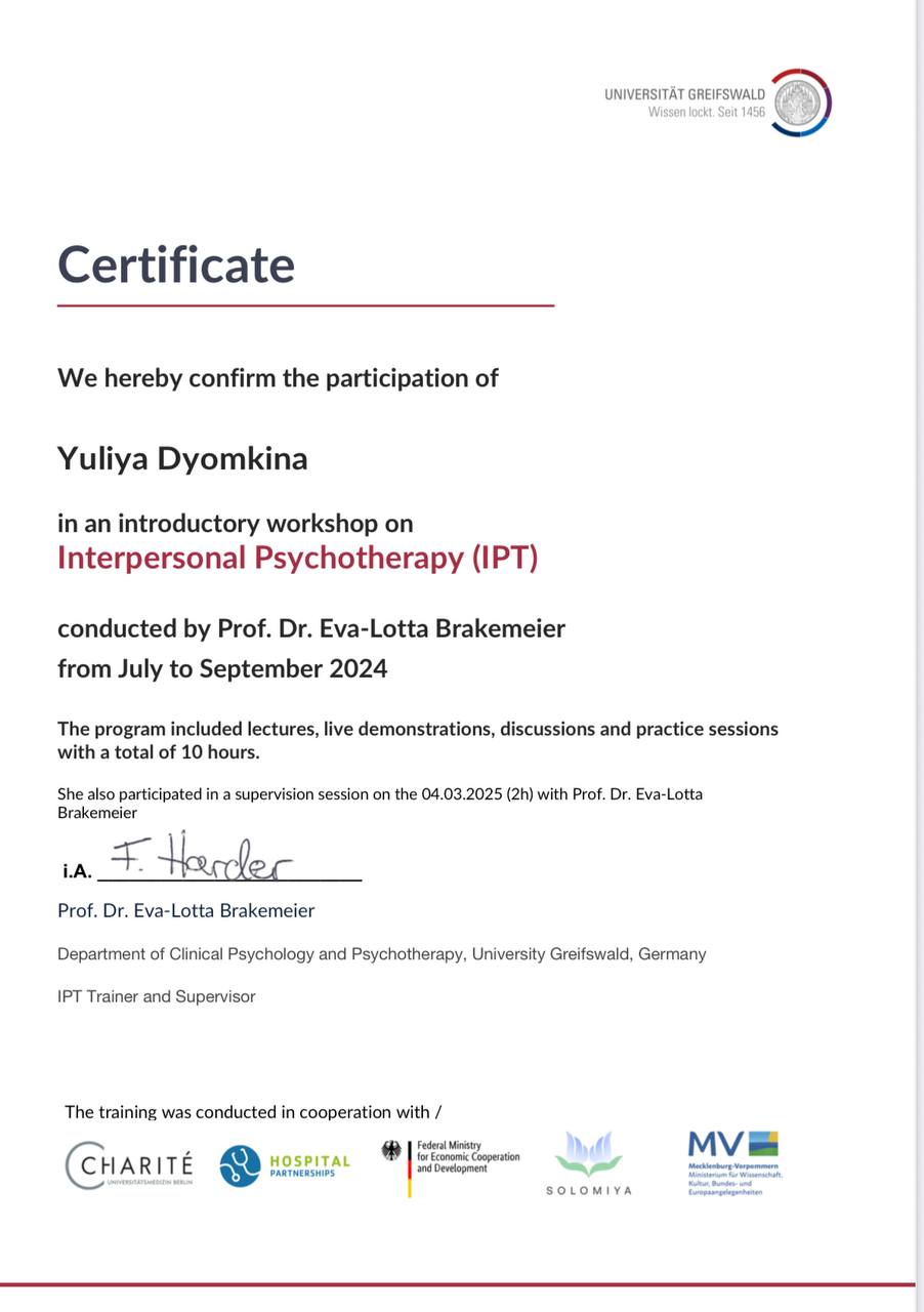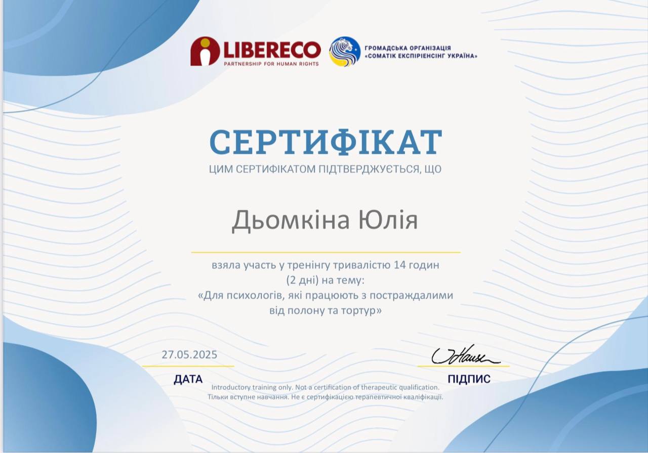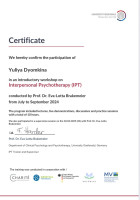 - 186 часов - Психология, психокоррекция психосоматических заболеваний и расстройств (Институт репродуктивной перинатальной психологии, Киев)