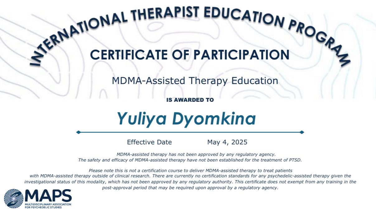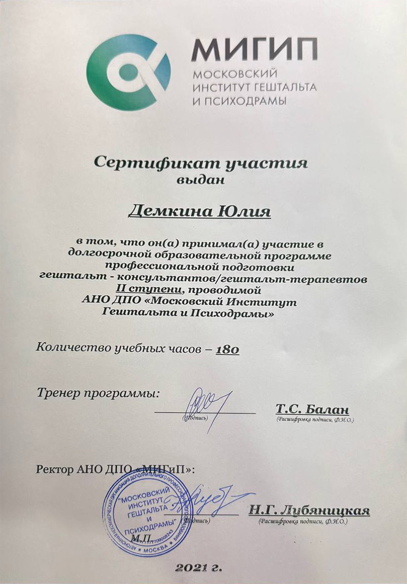 - 285 часов + интервизии, групповая терапия, супервизии, 2 степень гештальт-метода МИГИП (участие в сертификации не принимала по идеологическим причинам)